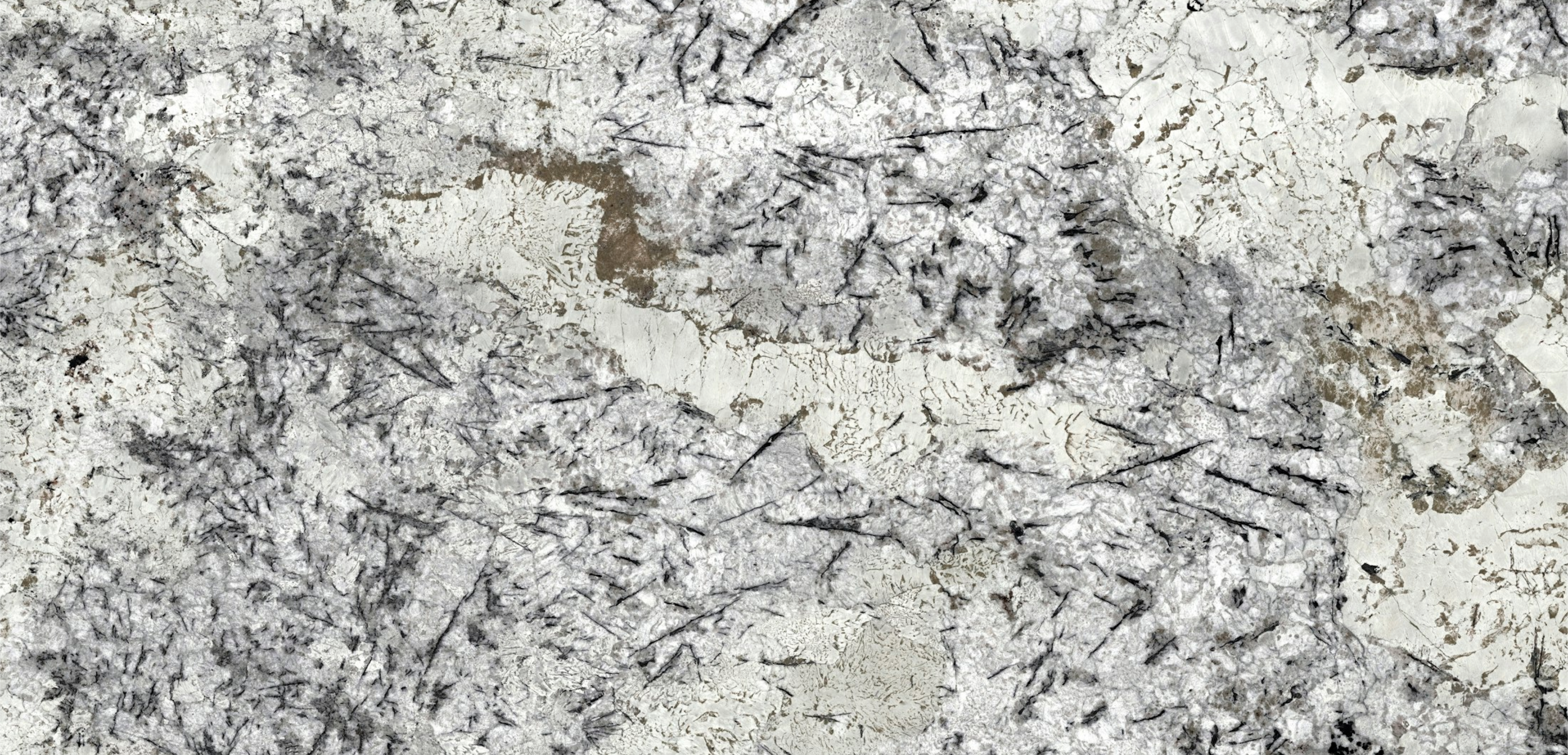 Brazilian granite with a white background crossed by black spots and veins of cream and toasted tones.