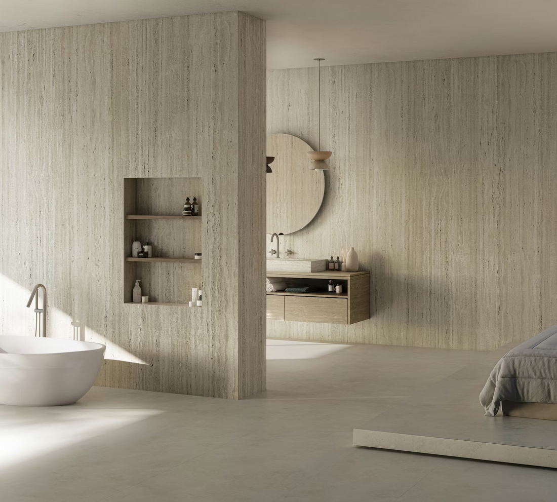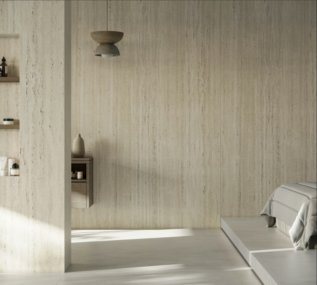 The hyper-realistic graphic of this colour perfectly recreates the depth of open-pore Roman travertine, but with a non-porous finish that increases strength and beautiful irregularities that add a timeless uniqueness to any design.